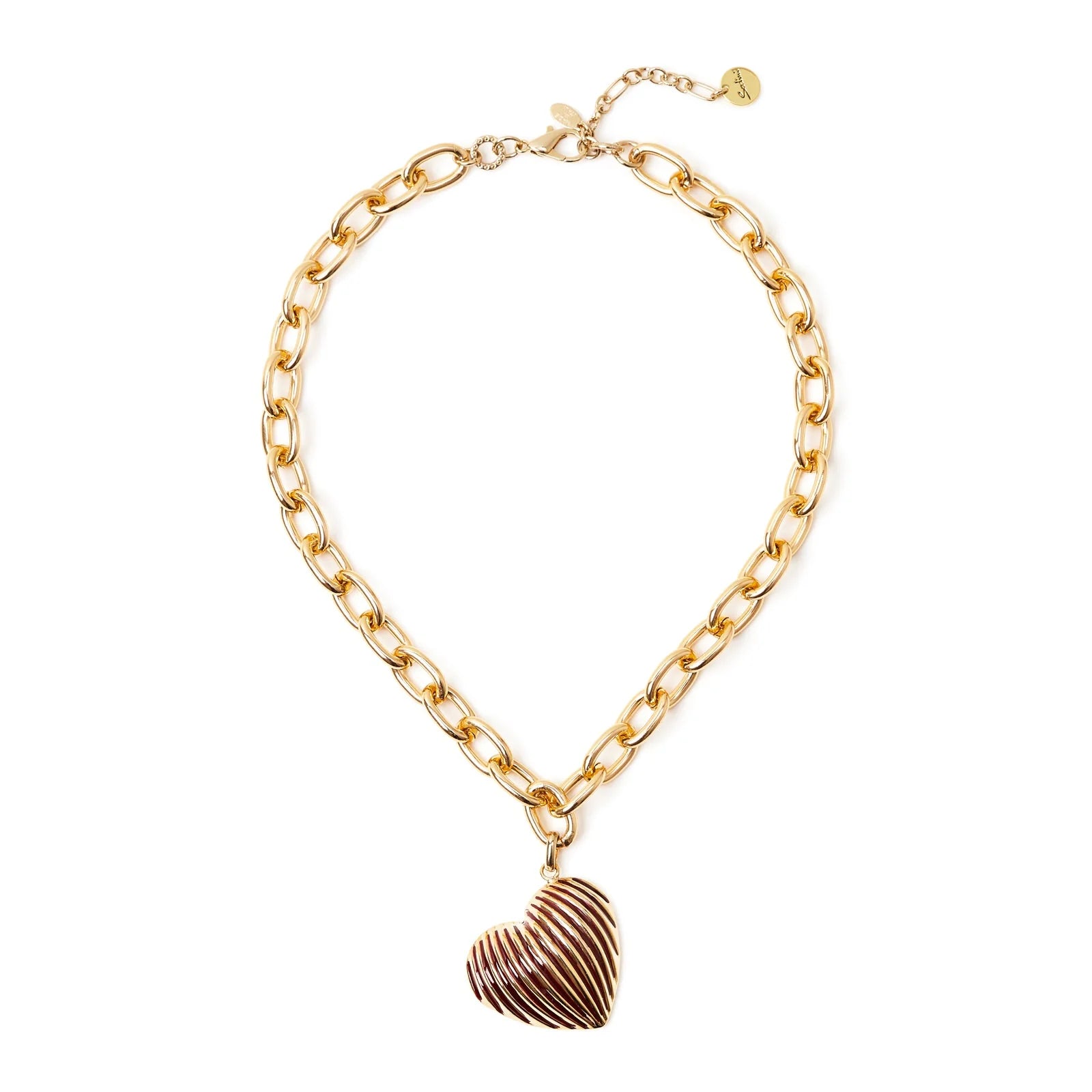 Questo girocollo assolutamente chic è il miglior complemento del proprio outfit. Design luminosissimo con splendente catena forzatina a grandi maglie impreziosita da un ipnotico pendente a cuore scanalato dai riflessi inebrianti. Un accessorio perfetto per un look impegnato o per quando vuoi tu, in una versione dalle cromie del bordeaux e oro. Targhetta Sodini sullestensione.