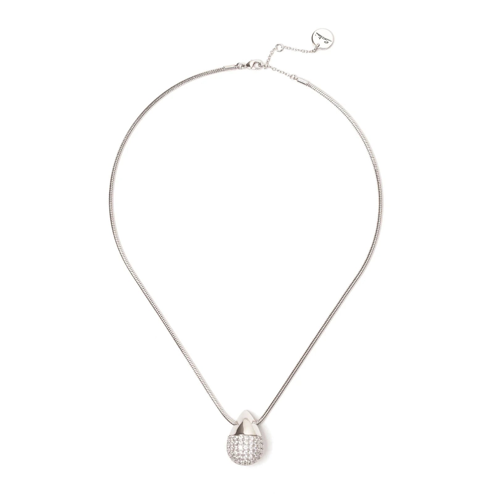 Questo girocollo è il complemento che ti dona un aura di glamour con stile. Design luminoso con splendente catena serpentina che incontra un favoloso charm a goccia impreziosito da pavè di brillantissimi mini zirconi che portano splendore al decollete. Un accessorio in una versione dai toni del cristallo e rodio, perfetto per non passare inosservata. Targhetta Sodini sulla catenina di estensione.