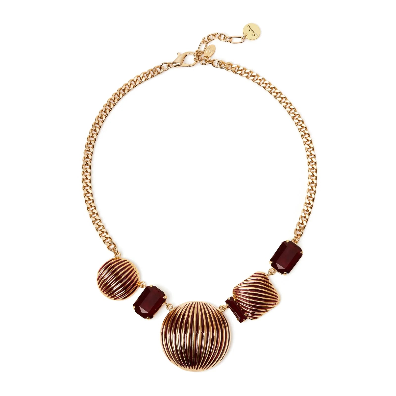 Un girocollo speciale e pregiato che da a chi lo indossa un tono davvero elegante. Design luminosissimo con splendente catena groumette e grandi charm bombati a righe scanalate dai riflessi inebrianti. Un accessorio perfetto per un look impegnato o per quando vuoi tu, in una versione dalle cromie del bordeaux e oro. Targhetta Sodini sullestensione.