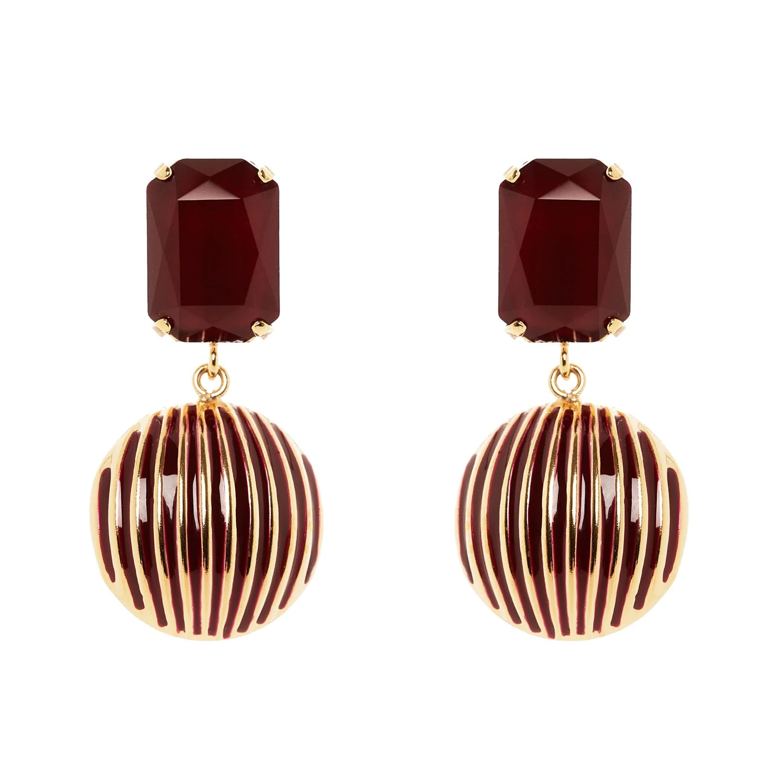 Un paio di orecchini per la donna che si adorna di dettagli assolutamente chic. Design esclusivo con un cromatico elemento ottagonale che sorregge una radiosa semisfera dalle linee scanalate e cromie a contrasto, per un unicum che impreziosisce il viso. Una coppia di accessori perfetti con qualunque outfit, in una versione dai toni del bordeaux e oro. Logo Sodini sul retro.